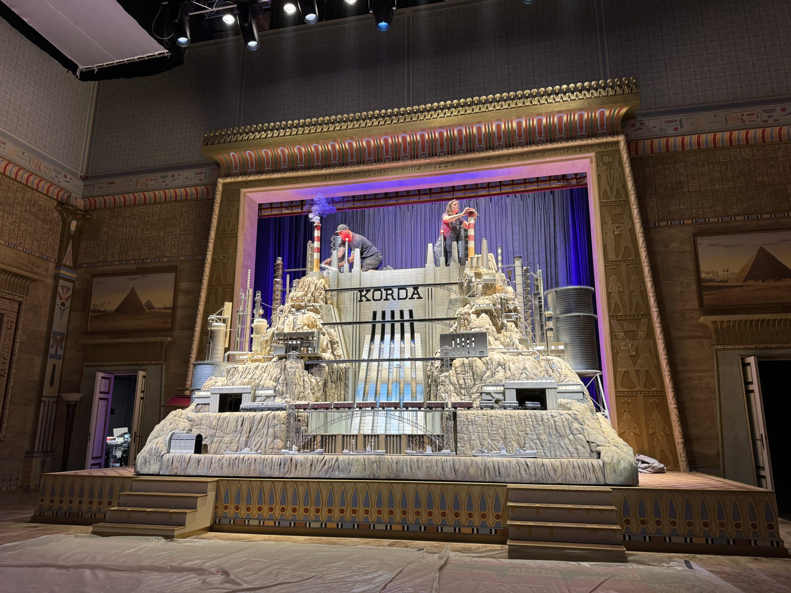 Simon reveals, “Zsa-Zsa Korda, an entrepreneur who goes to a certain part of the world, cheats in his business dealings and makes strange deals. He builds rivers and dams and train lines and tunnels, and all these different places where he worked – are combined inside this model. We have a factory with a smoking chimney. So you have all this mixture of nature and industrial landscapes that were the inspiration for the model. If you look closely at all this, it cannot work. It’s totally fake from beginning to end, but it looks good!”