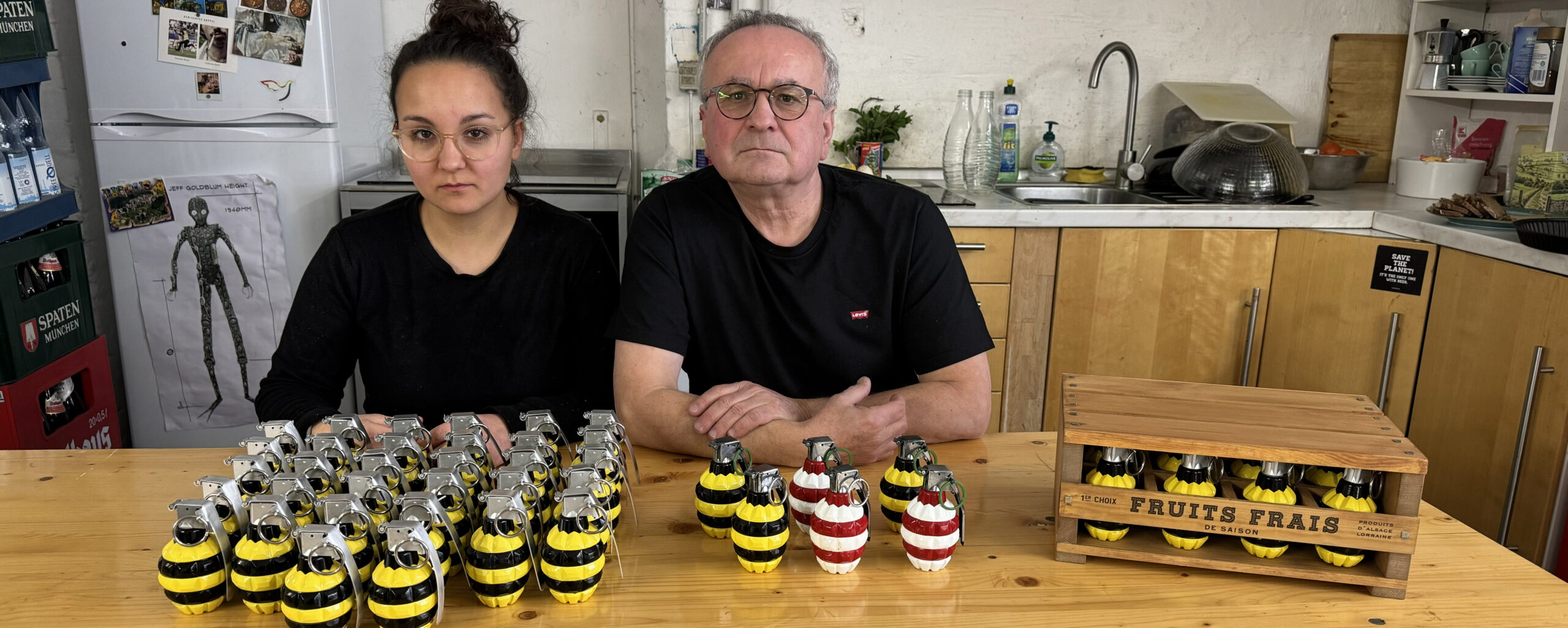 Simon Weisse and his team built quite a few props for the film: black-and-yellow hand grenades, the lie detector, a double-edged sword, a dynamite bomb, and more.