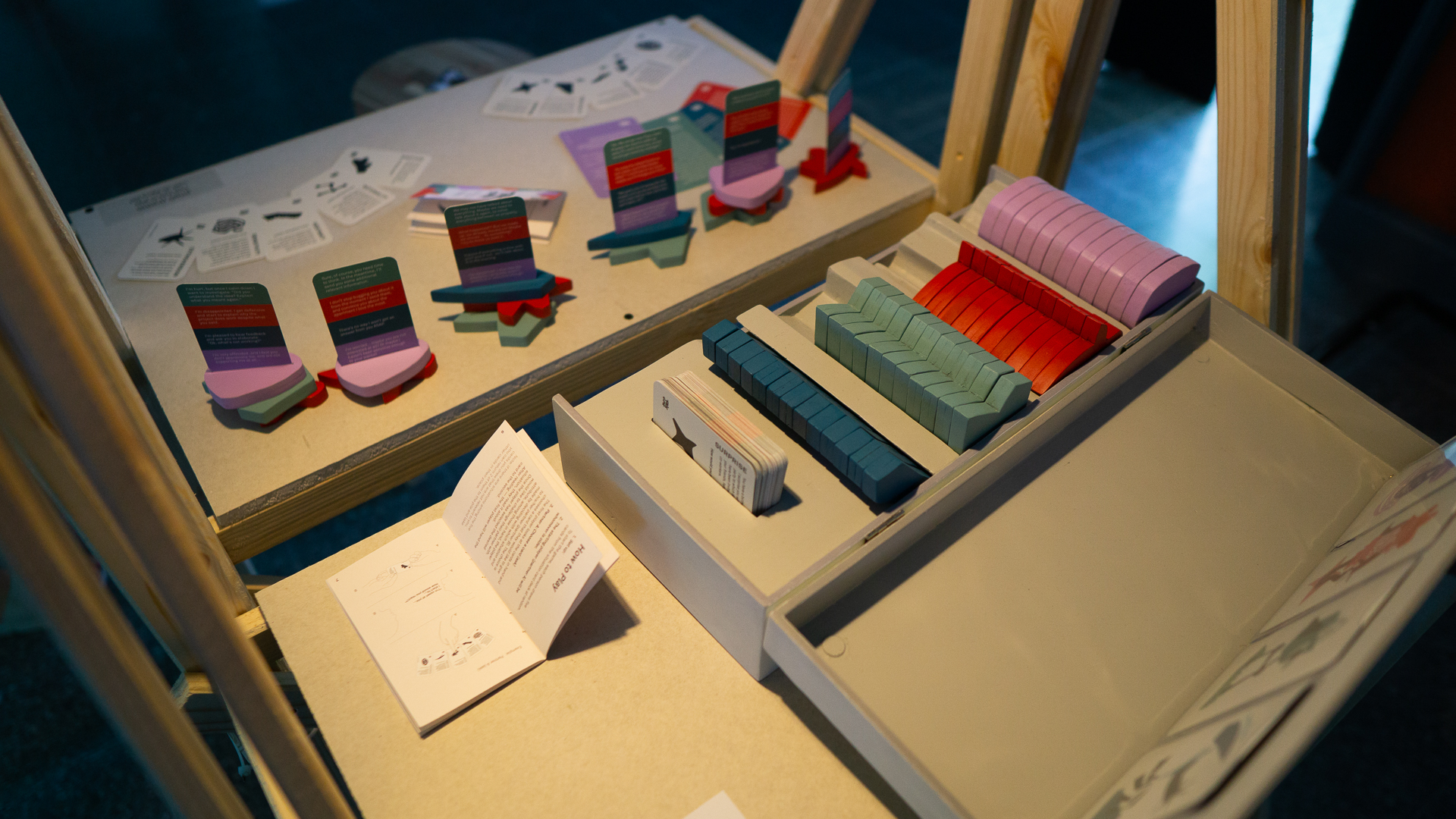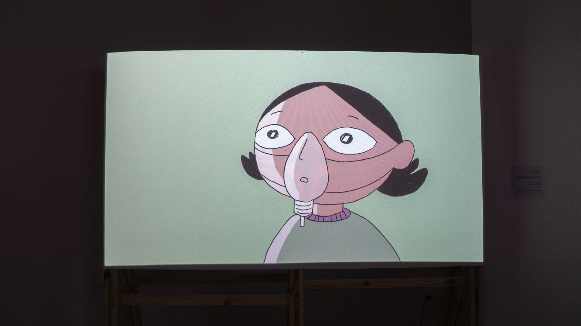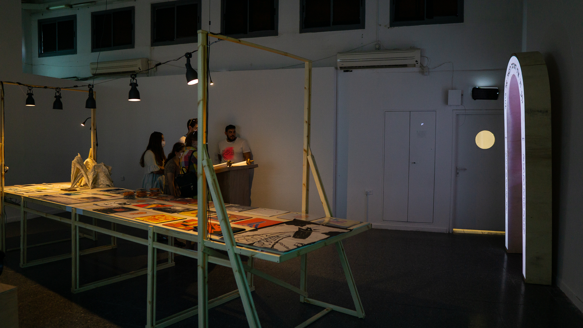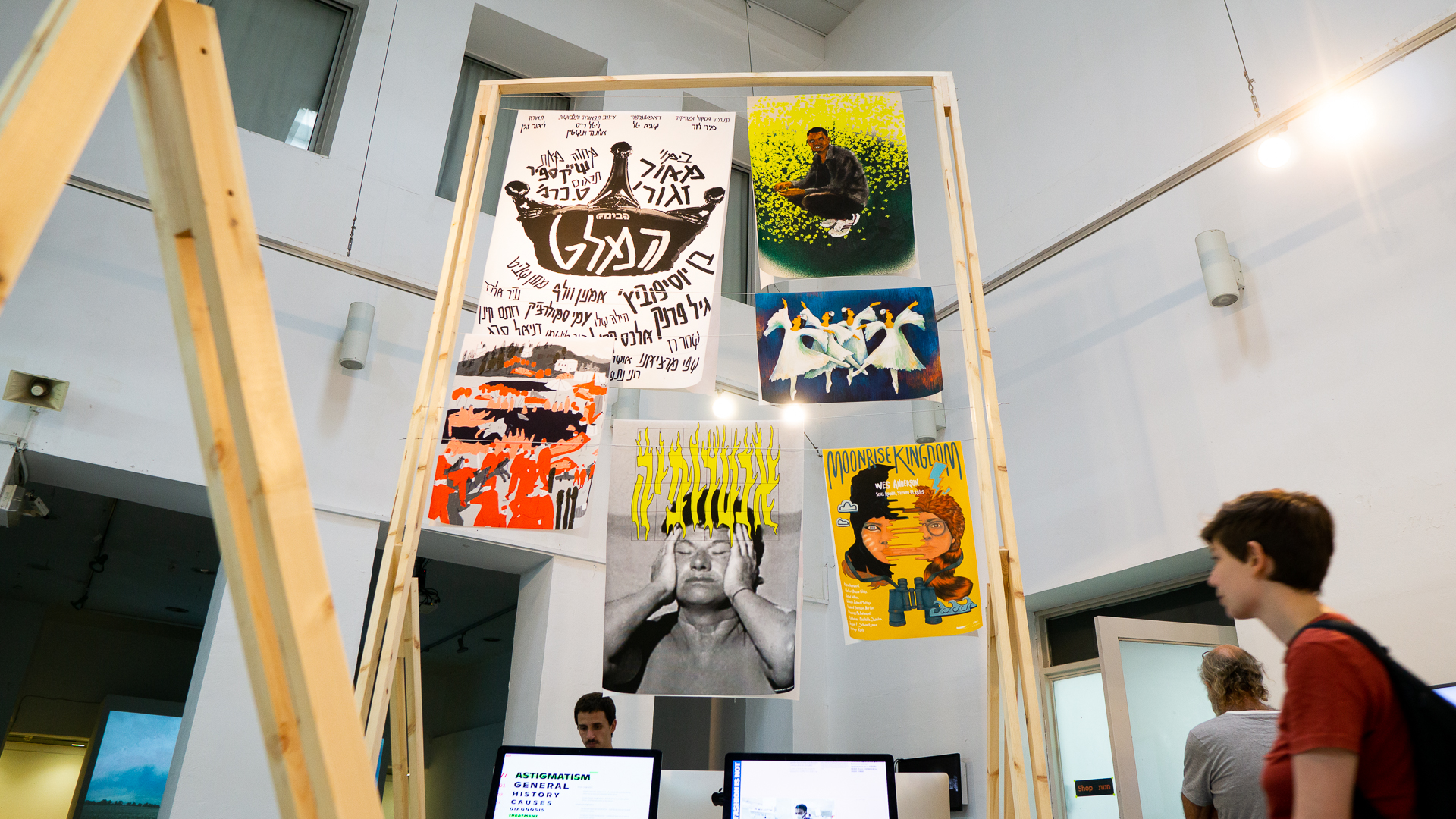 בשנה שעברה, אי שם בתדר, האוצרות בחרו לתת לכל פורמט חלל יעודי משלו. נראה שועקנין וסלינגר לקחו מזה השראה, וגם השנה הייתה הפרדה נהדרת בין הפרויקטים שצריכים הרבה אור – גזרת הפרינט: ספרים, פוסטרים, מיתוגים, לבין גזרת המסכים: סרטוני אנימציה, ממשקים, משחקים ושילובים בין המדיות. מצד ימין החלק המואר, מצד שמאל החלק המוחשך. זו בחירה אוצרותית כל כך מבריקה, ואולי יסכימו להמשיך איתה גם בשנים הבאות. מפעם לפעם חוצצים את המדיות הדיגיטליות עם נגיעות פרינט מוארות קלות בחלק המוחשך של הקומה. בקיצור, מאז התערוכה המופתית שאצר המעצב איל זקין (גם הוא בוגר המחלקה), נראה שזו עומדת להיות תערוכה שתיזכר לדורות קדימה, ובצדק.