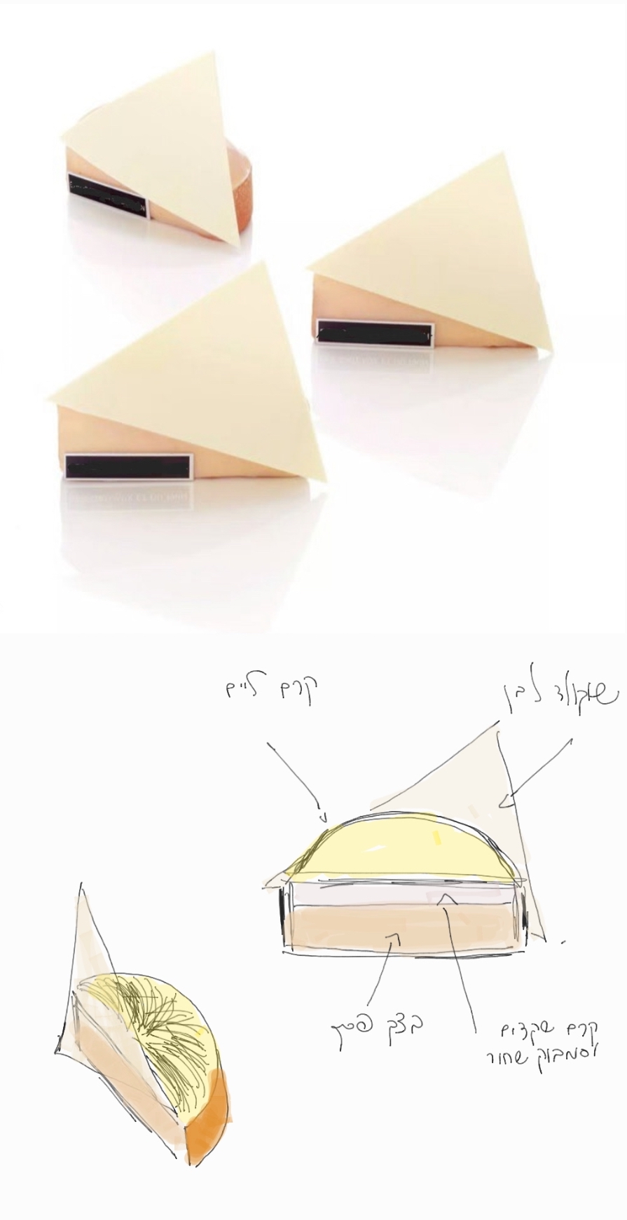 תראה, ביצירה של קינוח בד"כ אני משתדל לשרטט איזה שהוא משהו כללי, במיוחד אם בונים משהו עם שכבות, אז אתה רוצה שזה יהיה כתוב ומסודר, אבל הרבה פעמים זה מאד ספונטני, כי ברור לי מאוד איך אני רוצה שדברים יראו בסוף. כשאתה מכין קינוח בתור איש מקצוע, זה לא באמת משנה לך אם תכין עוגת מוס עגולה או טארט, כי בסוף זו אותה טכניקה. אני חושב שהאתגר הוא דווקא ביצירה של העיצוב הסופי וזה משהו שאתה צריך לתכנן או שיהיה לך ויז'ן. אני הרבה פעמים נתקל במצבים שזה לא משהו שאני סגור עליו, ואז מתחילות בעיות. ואז פתאום זה לא יוצא בדיוק מה שתכננת, ואז זה יוצא פחות יפה בד"כ. אז אני חושב שהדרך ליצירת קינוח שאתה תהיה מרוצה ממנו, מתחילה באיזושהי השראה מאד ברורה וסקיצה עוזרת אם יש.