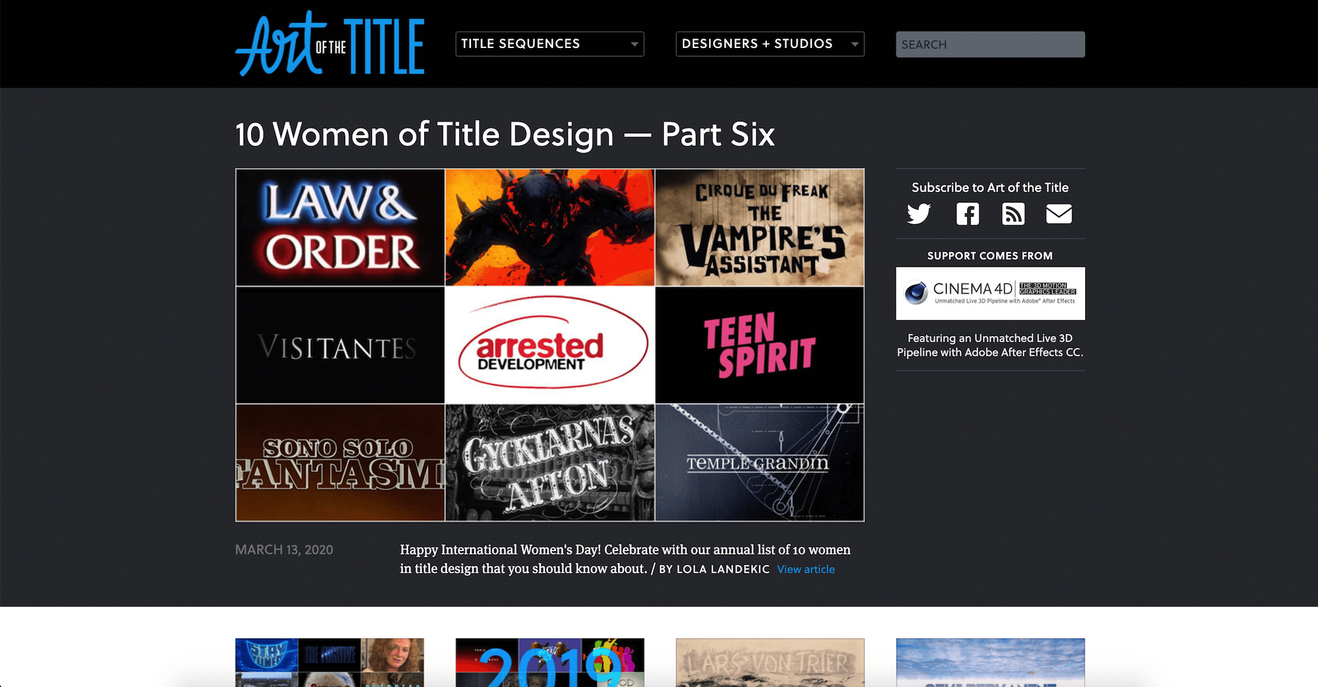 האתר שמפרק לגורמים את תחום עיצוב הכותרות והטייטל סיקוונס (פתיחים לסדרות וסרטים). אין כמעט סרט מוכר ומעניין שלא נכנס לשם, והאתר הזה חוגג את העניין לגמרי. הוא הוקם אי־שם ב-2007 ועדיין מתעדכן באופן רציף למדי. תענוג צרוף לעוסקים בתחום, וכאלו שסתם סקרנים להבין איך העולמות הללו נוצרים.