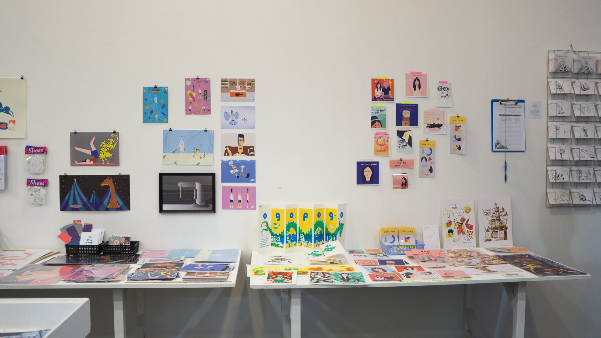 עבודות הפרינט (ספרים ופוסטרים) שמוקמו בסוף המסדרון הימני היו טובות מאוד, ואם תגללו עוד קצת למטה תקבלו פירוט שלהן. לעומת זאת, עבודות הפרינט שמוקמו בין שני חללי האינטארקטיב־מושן סבלו משולחנות קטנים מדי ופיזור לא נכון בחלל. מרבית הפרויקטים זלגו זה אל זה, ובהיעדר הבדלים מהותיים בסגנונות האיוריים והעיצוביים, נוצר כאוס. לא כאוס חיובי, אלא עומס ויזואלי מעיק, כזה שלא מאפשר לתת כבוד לעבודות המוצגות. נראה שלא הייתה ממש התערבות של סטודנטים בדבר. בפן הטיפוגרפי, שווה לגוון מלבד פונטים של הגילדה (שהם מצוינים), מה שיצר חוסר גיוון מעניין מספיק בין הספרים.
