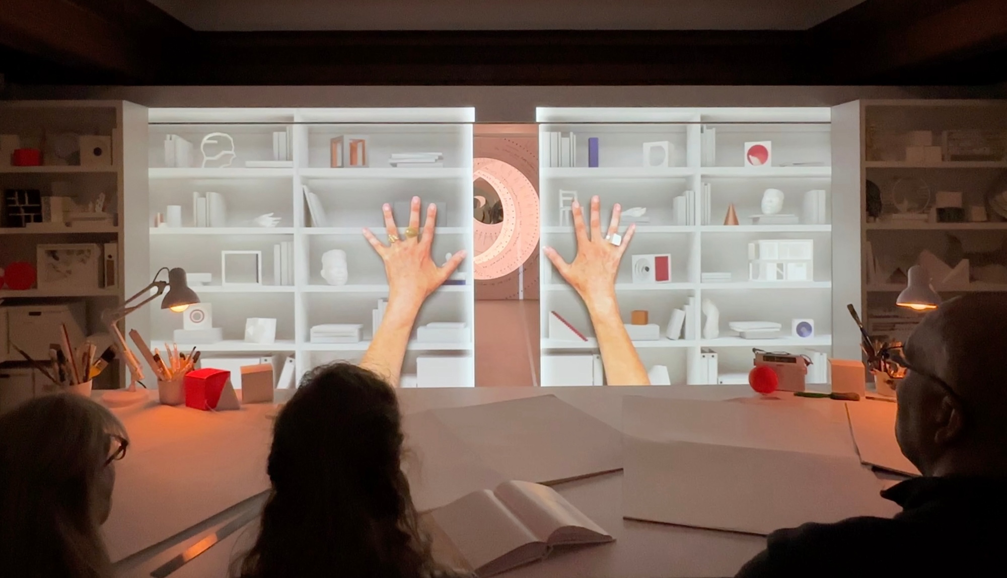 בכניסה לגלריה מבשרים לנו שהתערוכה תתחיל בוידאו קצר ומובילים אותנו אל חדר סגור. החלל נראה כמו חדר עבודה מתוך פנטזיה של מעצבת: הרמוניה בין ניקיון ויזואלי לבין עושר של שכבות המורכבות מפרטים מחושבים ומדויקים. מסביב – מדפים ועליהם פריטים מהסטודיו של דבלין: מחברות, שרטוטים, ציורים, דגמי קרטון, פסלים. במרכז – שולחן עבודה ועליו ספרים, ניירות וכלי עבודה. הוידאו, המלווה בקריינות של דבלין המספרת על תהליכי עבודתה, מוקרן תחילה על השולחן, על הספרים הפתוחים שמונחים עליו, ובהמשך על הקיר שמולו. הקיר מתגלה כדלת שנפתחת עם סיום הסרטון וחושפת את היצירה שפותחת את הסיור בתערוכה, ומשמשת גם כסוג של חלון המשקיף אל פנים הגלריה.