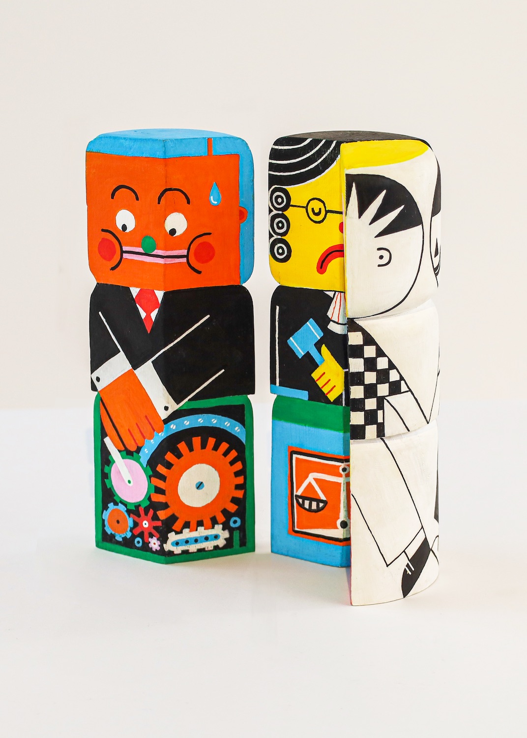 זה באמת היה אחד הקטעים היותר מאתגרים בעבודה הזאת, כי בהתחלה כל דבר הוא בנפרד, ואז לחבר את הכל יחד. בסלון הקטן שלי פרסתי נייר על הכל והתחלתי לסמן ריבועים ולהבין איפה כל דבר הולך לשבת ולהעמיד את זה. בסוף החלטתי על הפודיומים שמוצגים עליהם בתערוכה. בניתי אותם יחד עם אלון לפי המידות הספציפיות שהרגשתי שכל מערכת צעצועים צריכה.