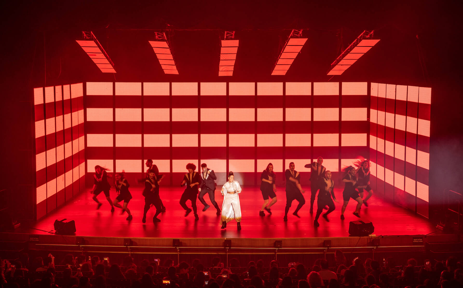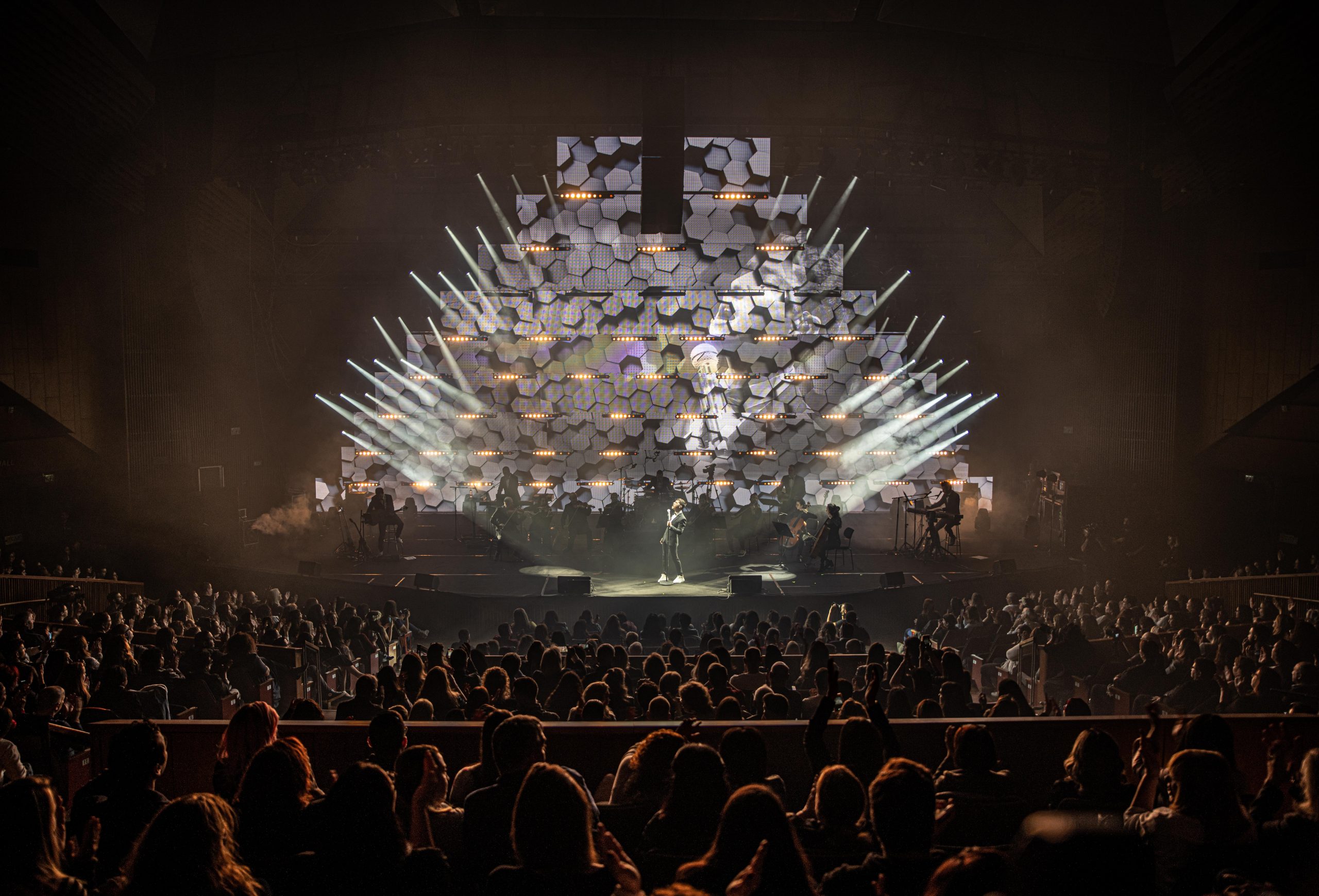 אז כדי שאני אוציא אחידות מכל דבר, אני צריך פלטה של משהו. והפלטה הזאת זה היה מסך לד. ואז הבנתי, אוקיי, אנחנו רוצים פלטה למעלה, פלטה למטה ופלטה שהיא לא סימטרית בגב במה מקצה לקצה, כאילו שהיא לא דומה, שהיא תשבור את הצורה הזאת.