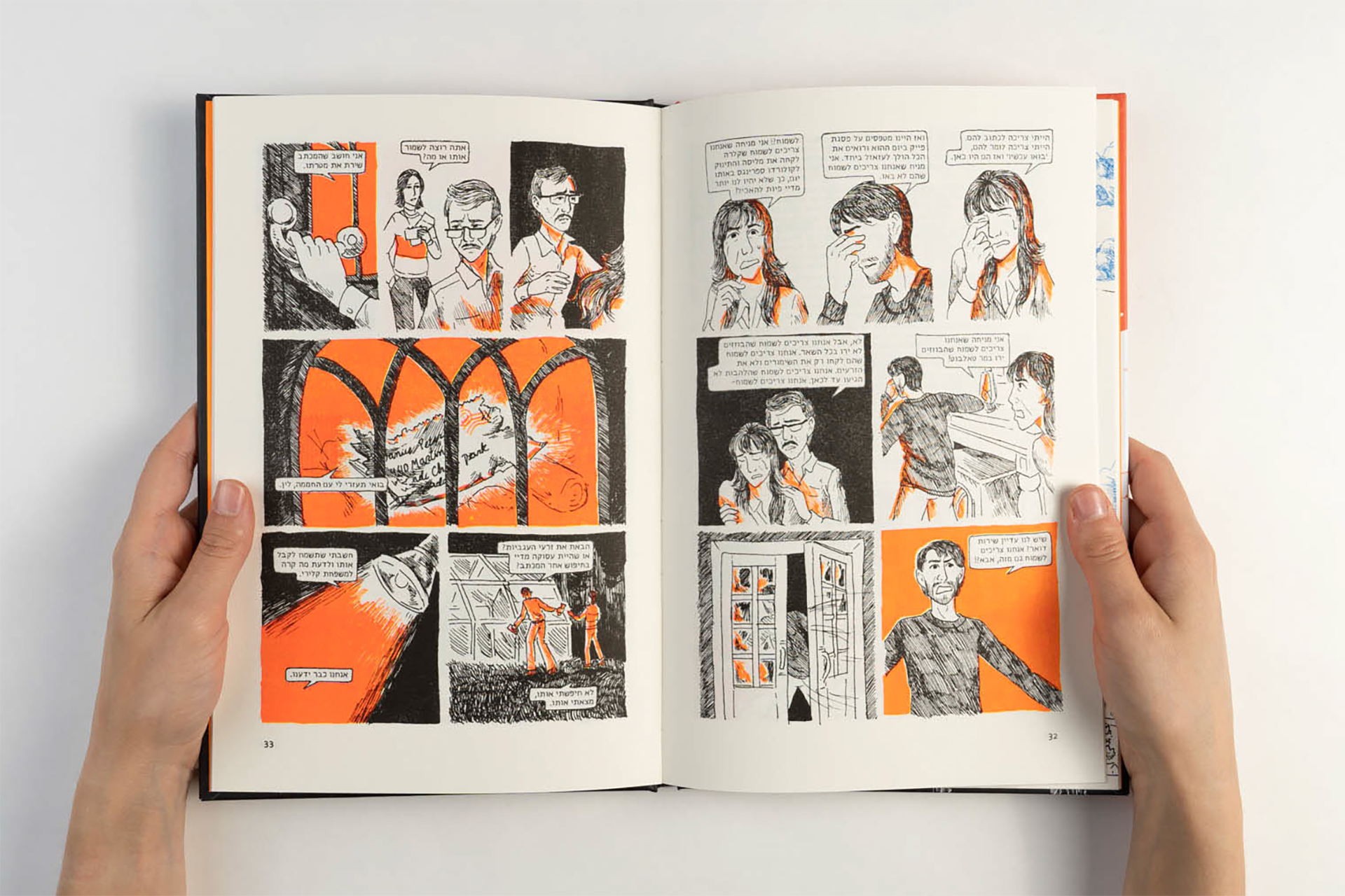 ״קומיקס לוקח הרבה זמן. הלחץ המיוחד התחיל ב-29.5, התחלתי מרתון של הספר. כמה עמודים ביום. עבדתי בשיטת הפרדת צבעים ידנית. את השחור על דף אחד, ואז עם שולחן אור ציירתי מעליו עם אותו עט את כל מה שעומד להיות צבעוני.