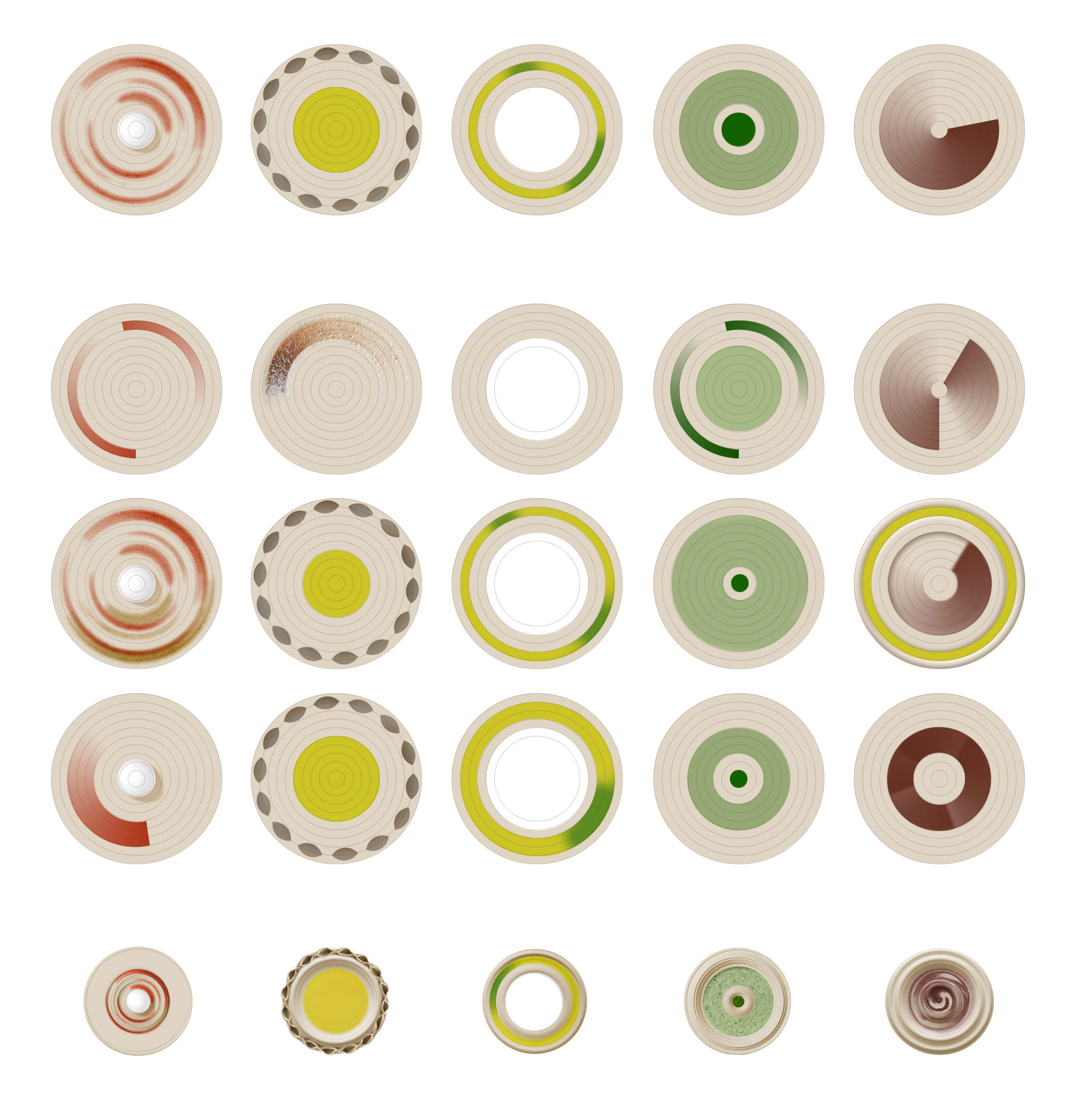 תהליך העיצוב התחיל בניסיונות של פאטרנים וחיתוכי לייזר לכדי שבלונות שונות. בעיצוב צלחות, למשל, מעצבים את החתך שלהם, וסטודיו Reddish מציגים אותם בתערוכה. שטיינבוק משתפת, ״צלחת פול היא יותר קטנה בקוטר ויותר גבוהה. יש פה גם מהלך מסורתי, אבל זה גם שירת אותנו מבחינת הקומפוזיציה למסכים, שהשבירה של אותו מעגל שבדיוק חוזר על עצמו״.