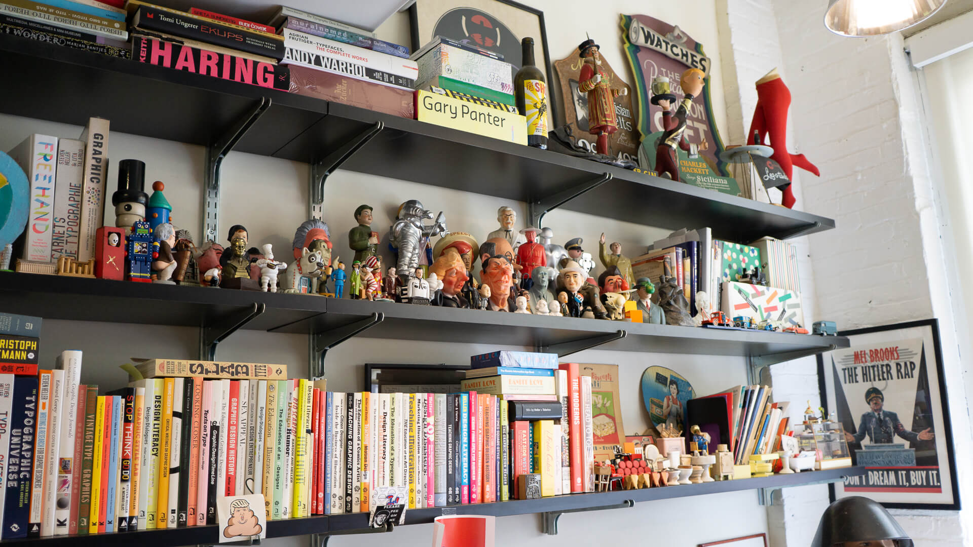 המשרד של הלר עמוס בפרטי עיצוב – ליתוגרפיה ענקית ומהממת של המעצבת והאמנית פולה שר, בובות, ספרים ומגזינים. מזל שהמדפים חזקים. התכנסנו כדי לדבר על ספרים שעתידים לצאת, ועל מהלך העבודה על ספר.