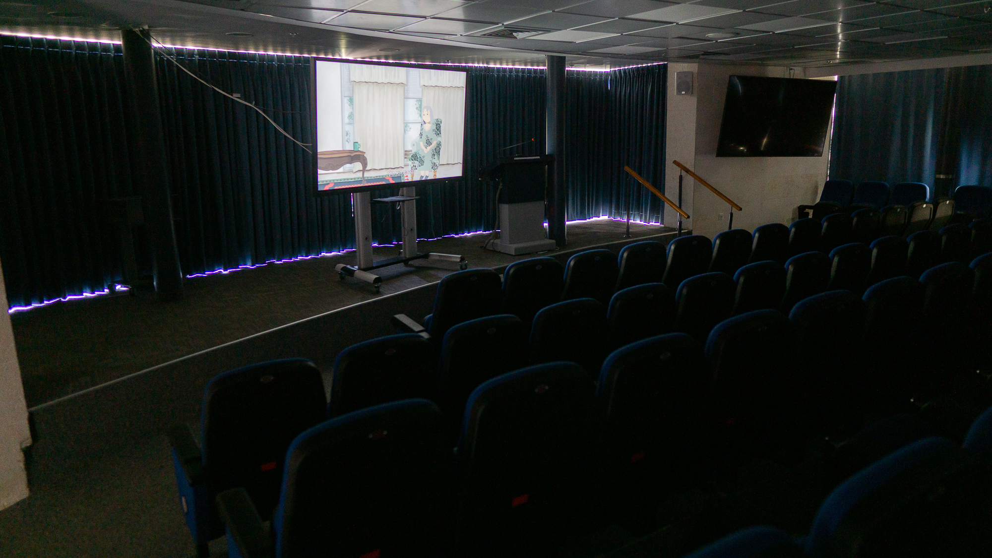 שני פרויקטים בלבד, בכל חלל סוכת האבלים, בקושי שרדו את תנאי הצפייה הגרועים אך הצליחו לזרוח: טל זלזניק ומעיין ויזמן עם HI-TECH RUSH, משחק מחשב הומוריסטי לשני משתתפים, שקורץ באופן פארודי לעולם ההייטק המוגזם, הביזארי ו״המפנק״. הוא עובד, כיפי, מאופיין היטב. בצד יש פרינט שמתאר את כל התהליך היצירתי, דבר שחסר מאוד בפרויקטי גמר, בטח במשחקים מושקעים כמו זה (עוד עליו – בהמשך הכתבה). השני הוא ״מעל הדקלים״ של איתי דרור, סרט אנימציה מרגש על עבודי דרוויש, סבא שלו, שניזכר בילדותו בבגדד, בנסיון הבריחה שלו לארץ ובמאסר שהוטל עליו. לא הייתי מסוגל לצפות בו בתערוכה (הוא לא אשם, תראו איך המסך נראה בתצוגה), ולכן צפיתי רק בדיעבד בסטודיו.