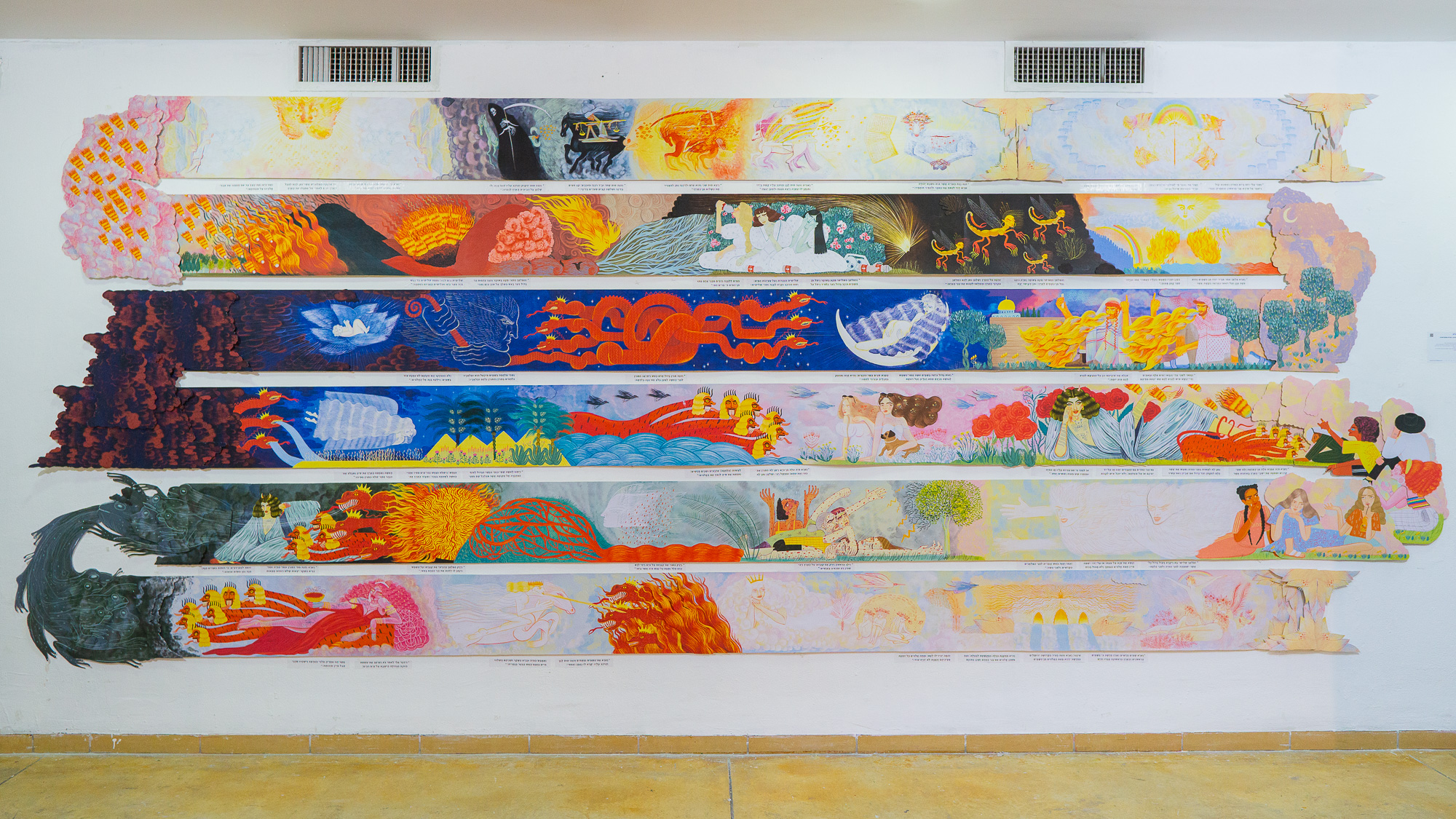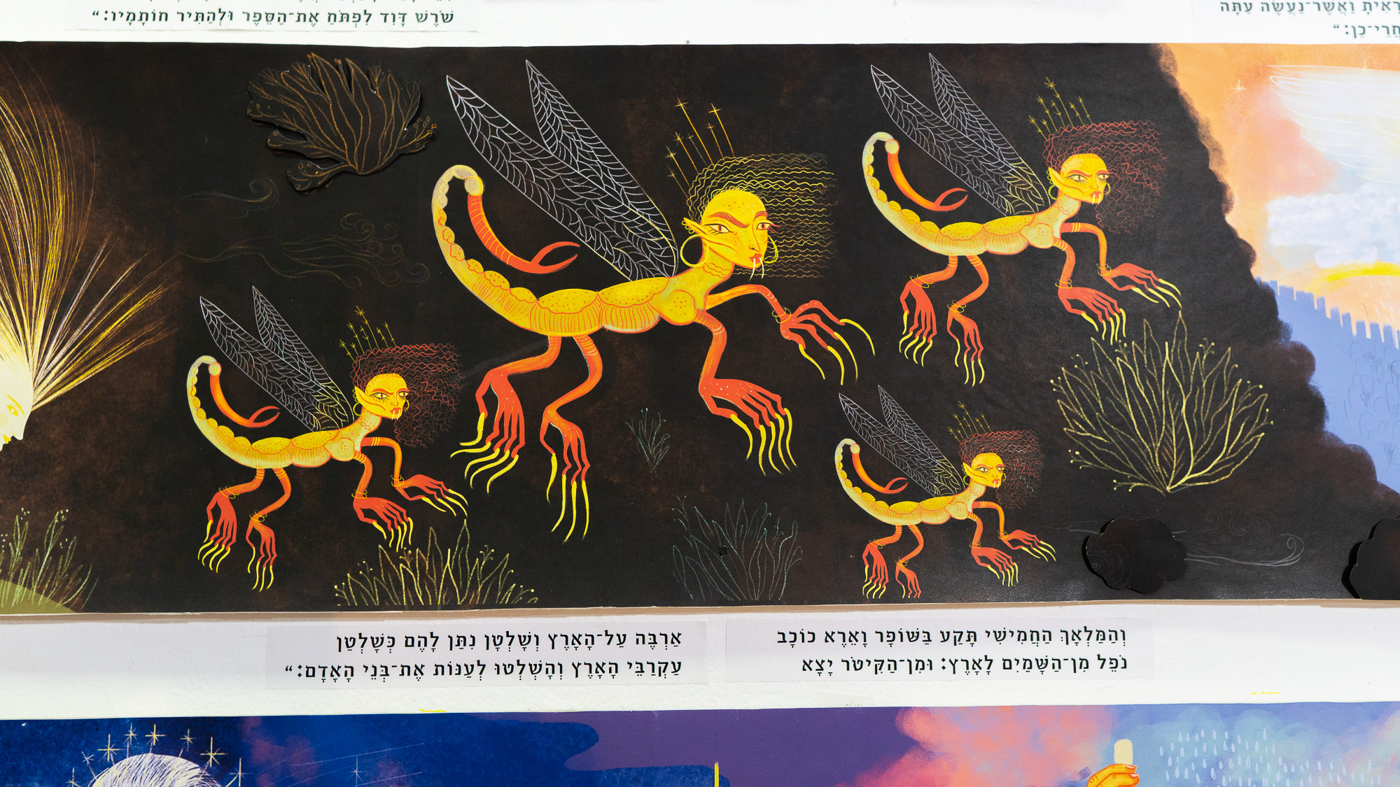 המאיירת ליה יוחבץ הצליחה לייצר ספר מאויר ומרתק, ׳שפה משותפת׳, שעוסק ביחסים שלה עם בעלי חיים, שגם כתבה בעצמה – הישג לא קטן בכלל. המאיירת שושנה קרוגלוב איירה את ׳חזון הימים האחרונים / מגילת אפוקליפסיס׳, הפרויקט האיורי הכי מורכב ומעניין בתערוכה. שישה סטריפים ארוכים שופעים פרטים, רק הכריות האדומות הארוכות מתחת מיותרות.
