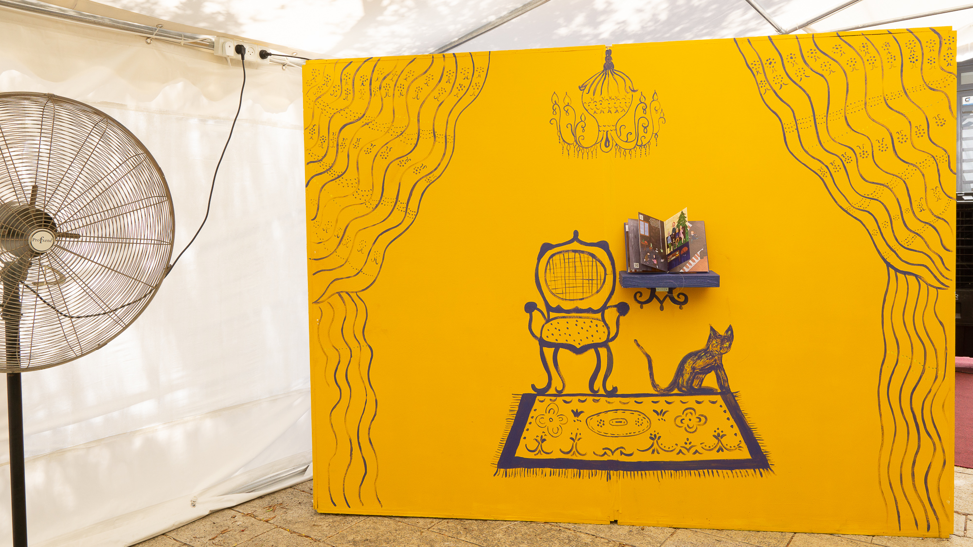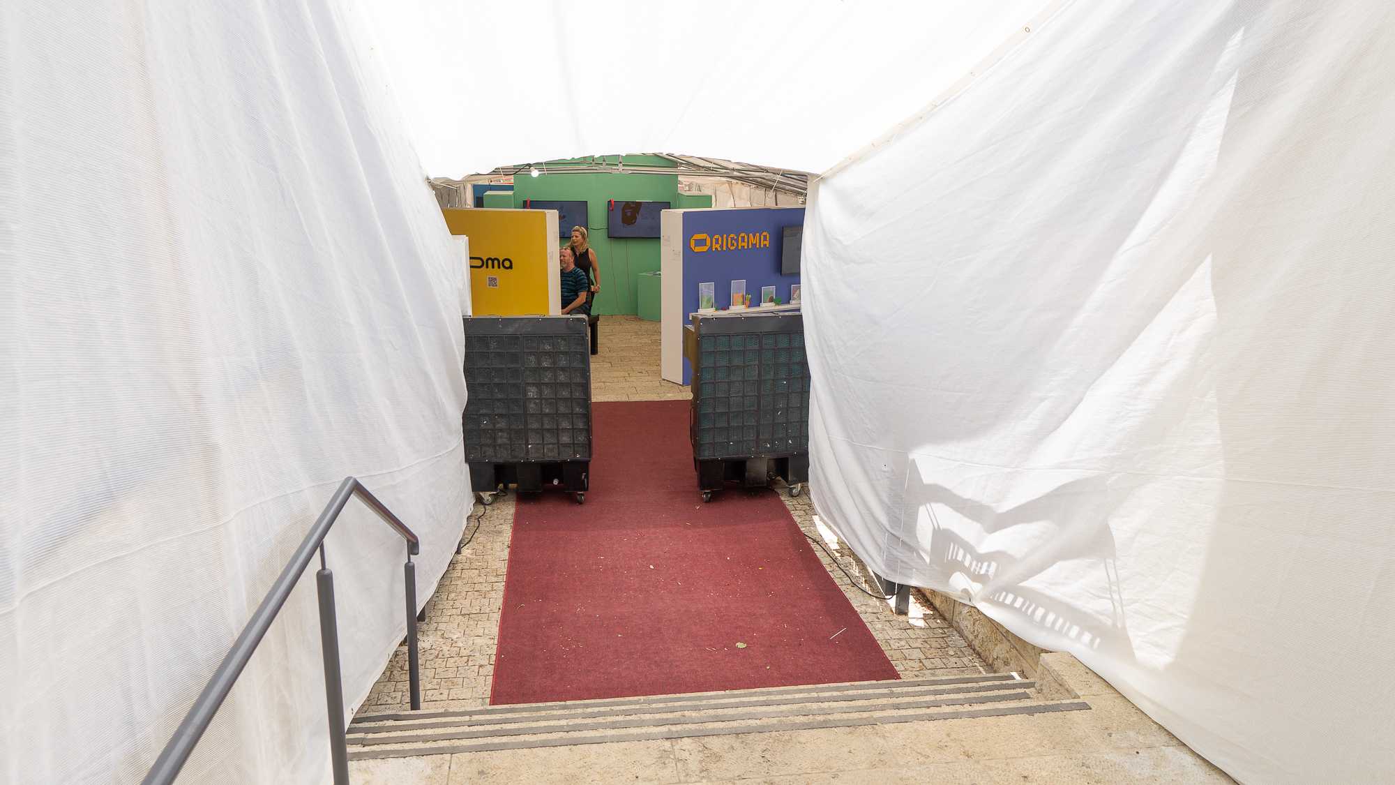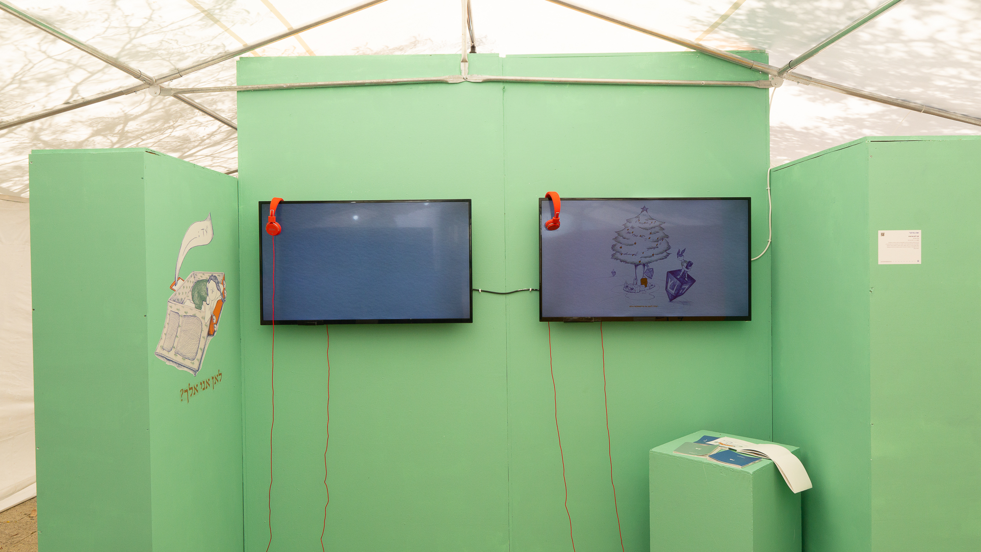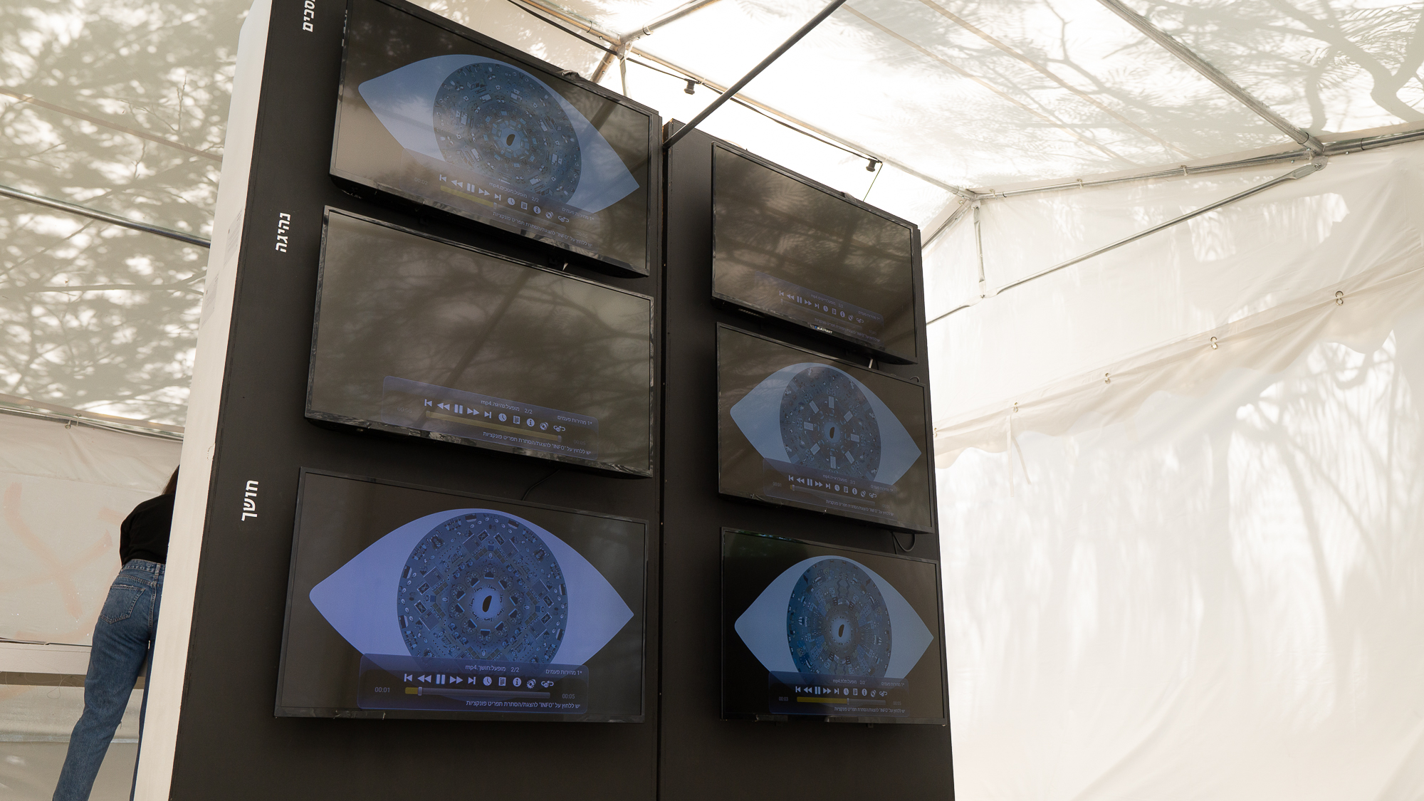 בסיום הסיבוב הקצר בחלל הכניסה, שאלתי את הסטודנטים במקום אם יש המשך לתערוכה כפי שהיה בשנים הקודמות. הם סימנו לי אל כיוון היציאה מהבניין. שם, מתקשה להאמין, נגלה לעיניי מחזה בלתי נתפס, הזוי ומביך – סוכת האבלים. במקום להמשיך את התערוכה אל הקומות העליונות של המחלקה כפי שהיה בשנים קודמות, הוחלט לשכור אוהל לבן בצורת מסדרון ארוך שהתחבר ליציאה מהבניין, לצרף קצת מזגנים ומאווררים תוך ציפייה שהשמש הלוהטת בחודש יולי תהיה סלחנית להתחממות הגלובלית, ועל הדרך תחרב את צורות ההגשה של הפרויקטים. רובם היו על מסכים שפיקסליהם לא עמדו בעוצמת האור מבחוץ.