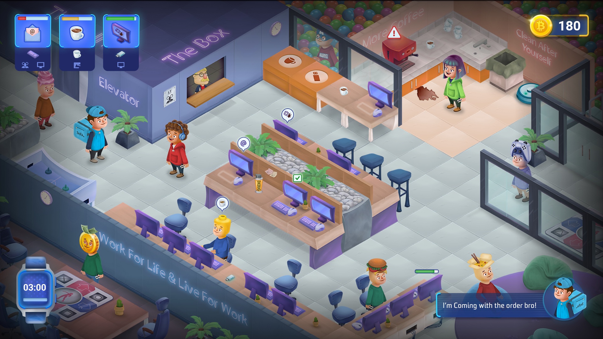 שקורץ באופן פרודי לעולם ההייטק המוגזם, הביזארי ו״המפנק״. מטרת השחקנים להתמודד עם עבודת צוות תחת לחץ ולהשיג כמה שיותר מטבעות, על מנת לעבור לשלב הבא – לקבל קידום בעבודה. בכל שלב ישנן משימות והפרעות אשר חווה השחקן הצוחקות על עולם ההייטק, והן כוללות משחקי מילים והקצנת המציאות.