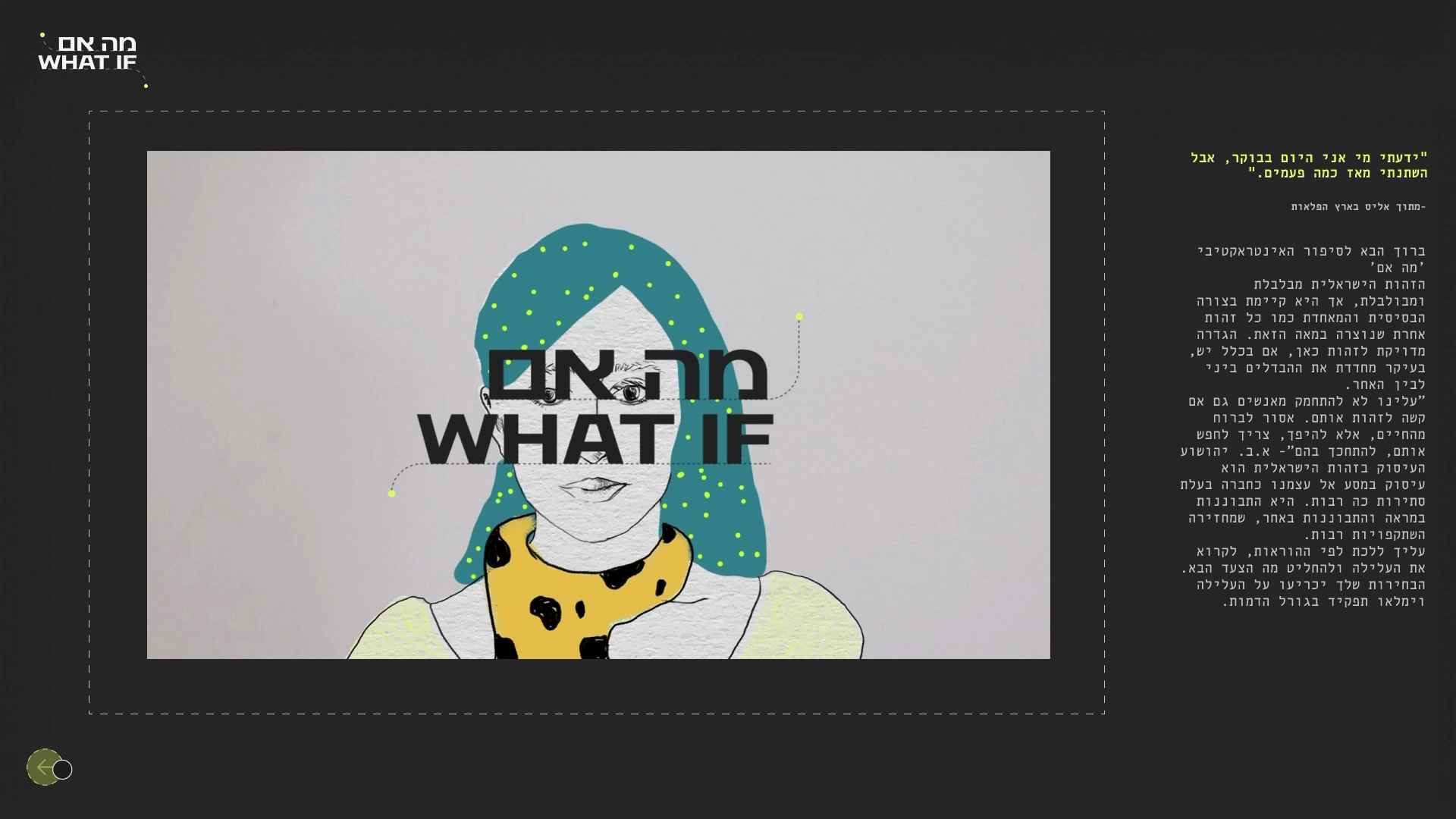 המעצבת אלייה איזנשטיין עיצבה את הסיפור האינטראקטיבי ׳מה אם׳, שזז בין צמתים במרחב הישראלי לנשים צעירות. שלל סיטואציות שיכלה להיות, לצד דברים שהפכו למציאות. יש פה הברקות גם ברמת חווית המשתמש, וגם השימוש באנימציית רוטוסקופ הופך את הסיטואציות האמיתיות לחלומיות.